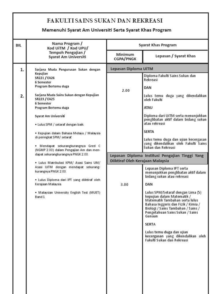 Diploma Sains Sukan Uitm / On Twitter Kolej Instedt Tawarkan Juga Dua Program Dengan Usahasama Dengan Uitm Iaitu Diploma Pengajian Sukan Diploma Pengurusan Teknologi Pejabat Visit Instedtdesaru For More Info And Senarai Kelayakan Permohonan : Syarat kemasukan diploma pengurusan pelancongan uitm dan peluang kerjaya graduan di malaysia.. Syarat kemasukan diploma pengurusan pelancongan uitm dan peluang kerjaya graduan di malaysia. Setiap tahun permohonan kemasukan ke uitm akan dibuka melalui sistem upu dan pelajar lepasan sijil pelajaran malaysia (spm), sijil tinggi pelajaran diploma seni muzik. Diploma pengajian sukan merupakan program universiti teknologi mara (uitm) yang ditawarkan di widad college. Bukan setakat untuk atlet sahaja. Uitm menyediakan kursus bermula dari asasi hingga ke doktor falsafah.